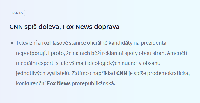 Takto si ČT24 představuje FAKTA. Bolševnickou CNN alias Communist News Network představuje jako „spíše prodemokratickou“, zatímco středové FoxNews říká „prorepublikánská“. Holt „CNN a ČT24 sucks“.