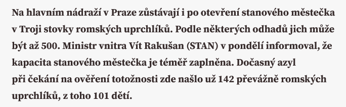 To k nám přijelo 300 000 Ukrajinců a bez větších problémů se zatřídilo. Pak přijelo 500 ciginů a nastal poprask. Na nádražích se to hemžilo připrchlíkama, kteří s povykem „nedaly nam byty“ se dožadovali všeho možného i nemožného a tábořili si. To by asi nebylo nic divného.