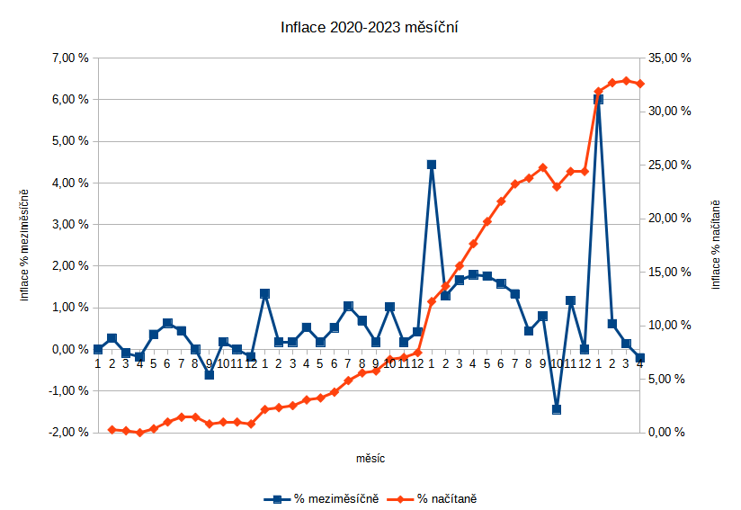 Takže tady máme vzorovou inflaci v roce 2020 (načítaně 2,29% za rok), stabilně rostoucí inflaci 2021 (6,61%), 4,5% skok v lednu 2022 a následný rychlý růst celý rok až do podzimu, pak stagnace (za rok 15,76%), 6% veleskok v lednu 2023 a od té doby růst nerůst. Celkový nárůst cenové inflace za sledované období je 32,61%.