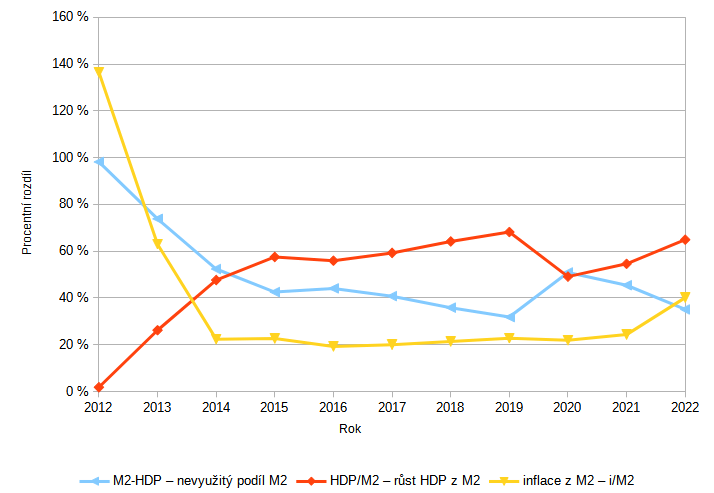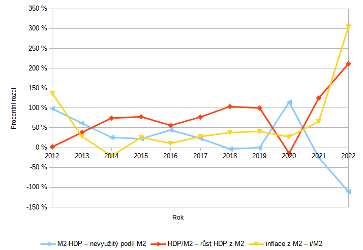 Když pomineme roky 2012-13 jako nedostatečně dlouhý horizont, pak výsledek tisku M2 je vcelku zřetelný. Z každé vytištěné koruny se průměrně zhodnotí jen 60%, zbylých 40% proteče ekonomikou bez užitku. Neužitečné množství by se mělo dostat do přímého zvýšení cen, ale statistická cenová inflace je většinově 20%, až na poslední rok 2022, kdy se natištěné peníze přeměnily na inflaci z oněch 40%. V předchozích letech 20% natištěných peněz zázračně vysublimovalo, nebo někde udělali soudruzi z NDR chybu ve výpočtu inflace a nebo jsou ty peníze v „rezervě“ na vytvoření inflační bubliny někdy někde.