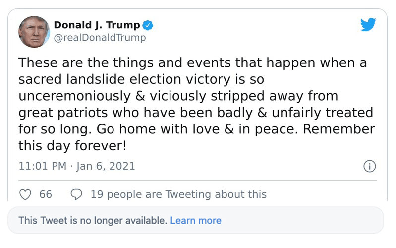 Trump reaguje na aktuální události v Kapitolu. Pak už mu bolševníci zablokovali účet, protože prý chce násilí a místo toho má držet hubu a krok.